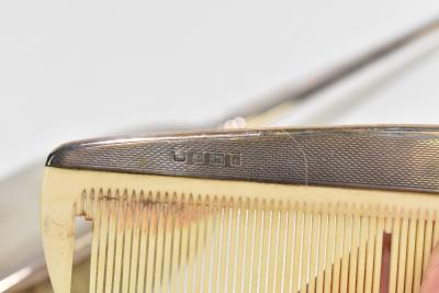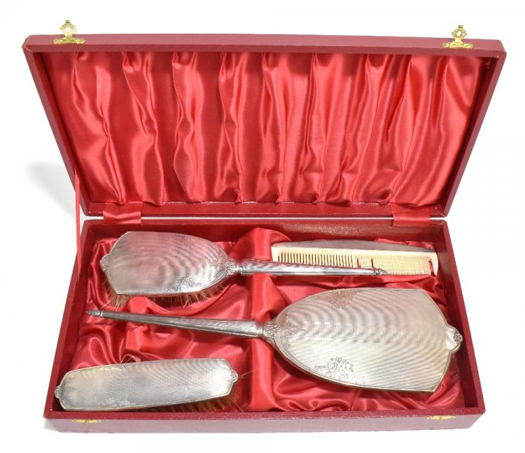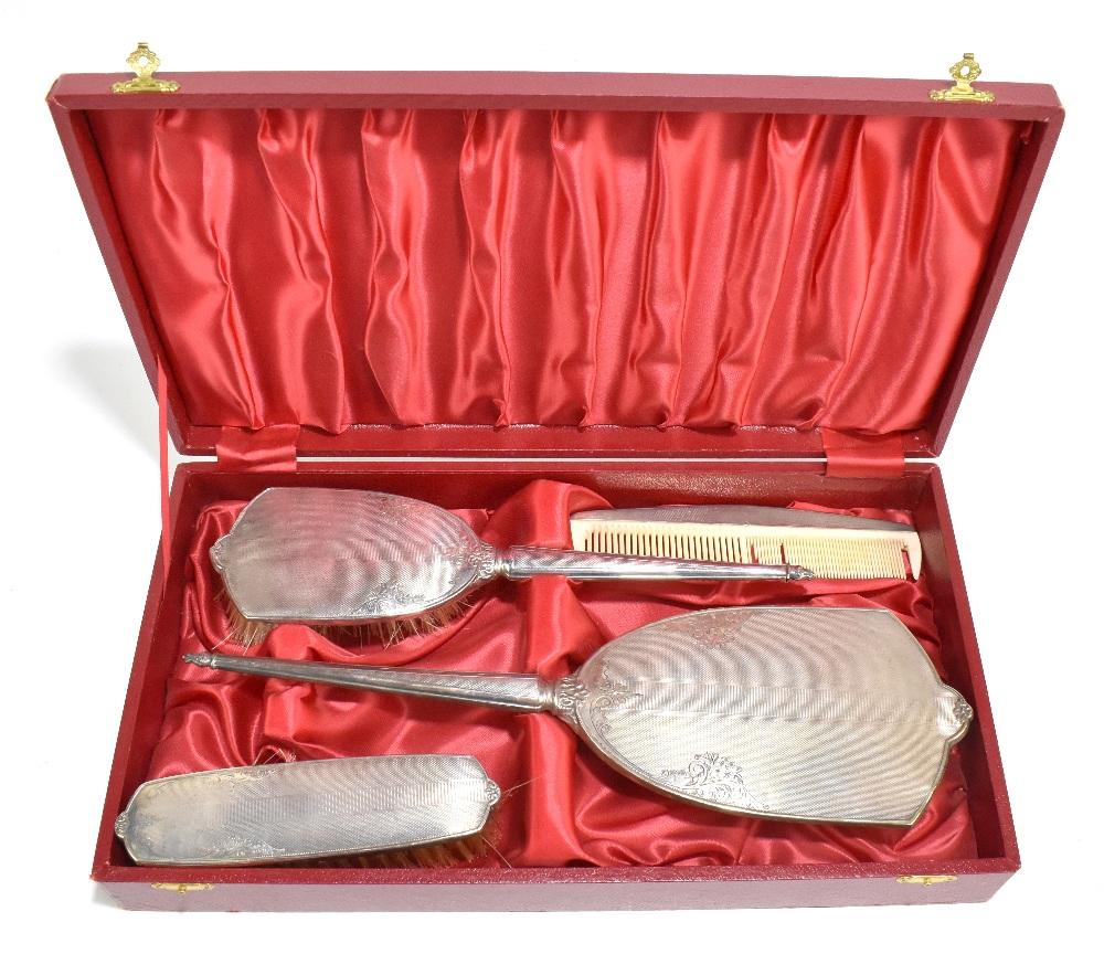 Lot 844 of 1032: CHARLES S GREEN & CO LTD; a cased Elizabeth II hallmarked silver mounted four piece dressing table set with engine turned and bright cut foliate detail, Birmingham 1967 (part af).
