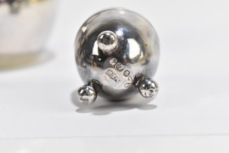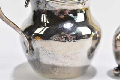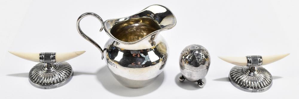 Lot 851 of 1032: JAMES DIXON & SONS; a pair of Edward VII hallmarked silver knife rests with ivory terminals, Sheffield 1902, also a hallmarked silver cream jug and pepperette, total weight 3.9ozt.