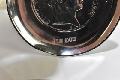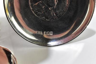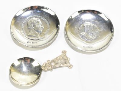 Lot 853 of 1032: JEWELLERY AND METAL MANUFACTURING COMPANY; an Elizabeth II hallmarked silver caddy spoon with cast Celtic knot detail to the handle, Dublin 1973, and two hallmarked silver pin dishes made by Charles Lambe, Dublin 1914, each example set with central coin including an Edward VII crown, approx 4.3ozt/134g.