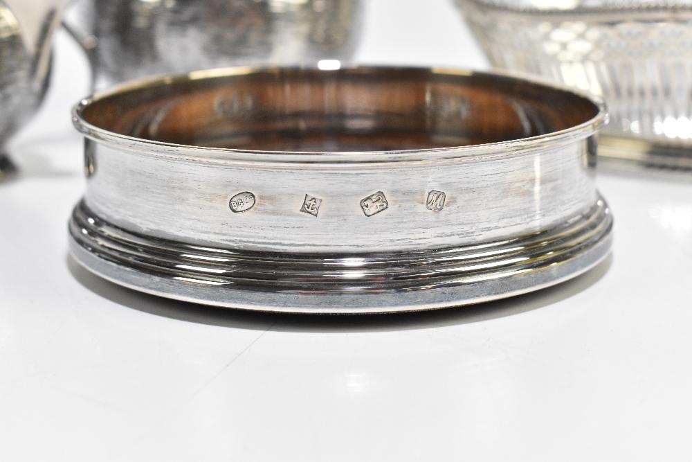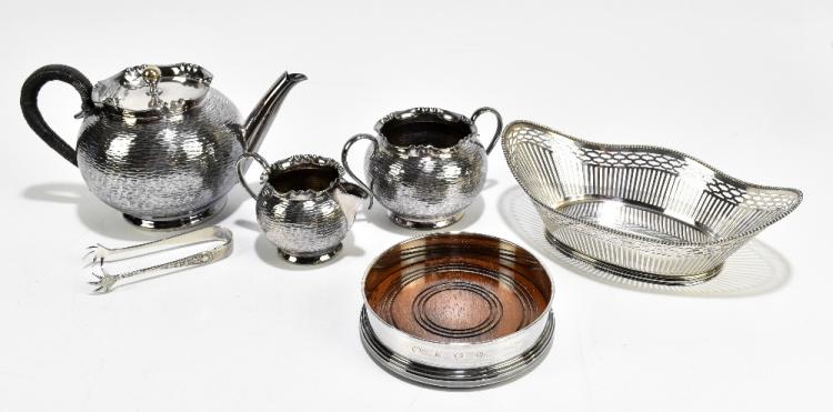 Lot 854 of 1032: A French silver bread basket with cast beaded rim above pierced body, length 22cm, weight approx 6.93ozt/215g, also a hallmarked silver mounted bottle coaster and a silver plated three piece tea service with textured decoration (5).