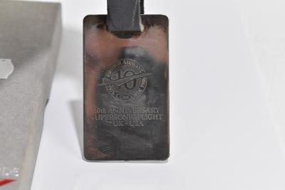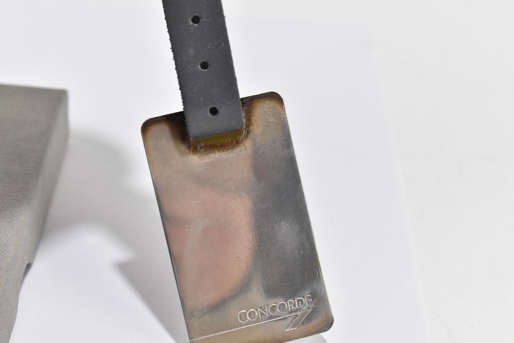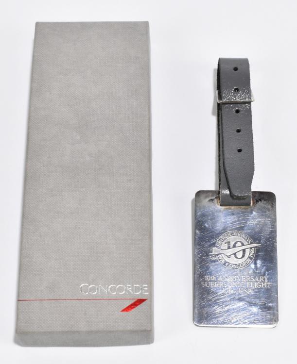 Lot 855 of 1032: CONCORDE INTEREST; a hallmarked silver luggage label produced to commemorate the 10th anniversary of the supersonic flight UK-USA, by British Airways, Birmingham 1986, with leather strap and fitted in original box.