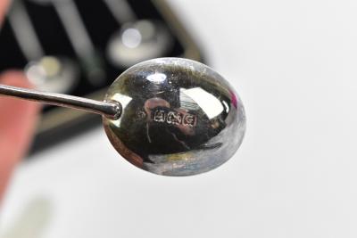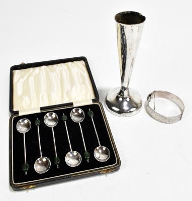 Lot 858 of 1032: ARTHUR PRICE & CO LTD; a cased set of six George V hallmarked silver coffee bean spoons, Birmingham 1931, and a hallmarked silver posy vase (filled) and bangle, approx 2.5ozt/77g.