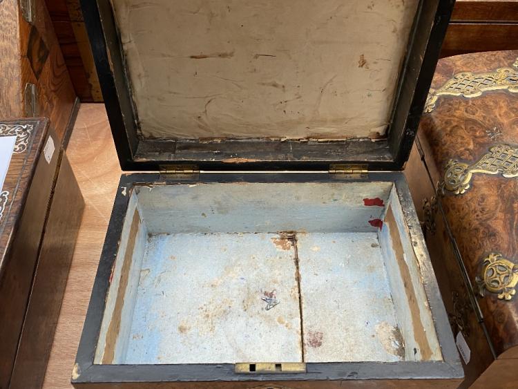 Lot 3 of 1033: A Victorian mother of pearl inlaid burr walnut work box of rectangular form with dome top, length 27cm, together with a set of Smith patent sovereign scales, length 9.5cm (2).