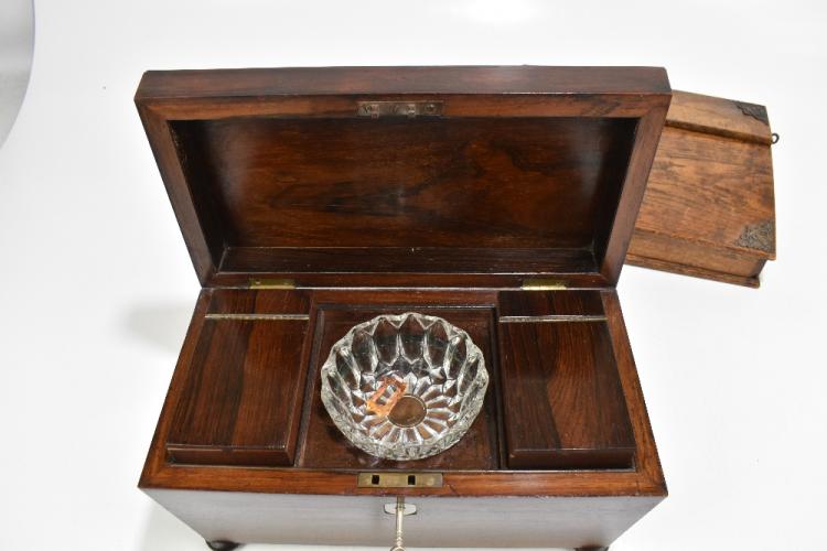 Lot 8 of 1033: A Victorian mahogany tea caddy, the hinged cover enclosing two compartments and pressed glass bowl, length 32.5cm, and an early 20th century oak writing slope, length 29.5cm (2).
