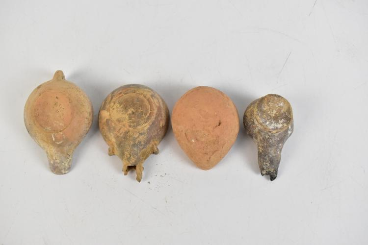 Lot 39 of 1033: Three Roman terracotta oil lamps, one of circular form with embossed decoration, length of largest example 8.5cm, together with a similar example (4).