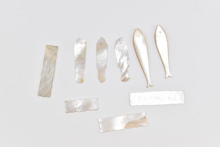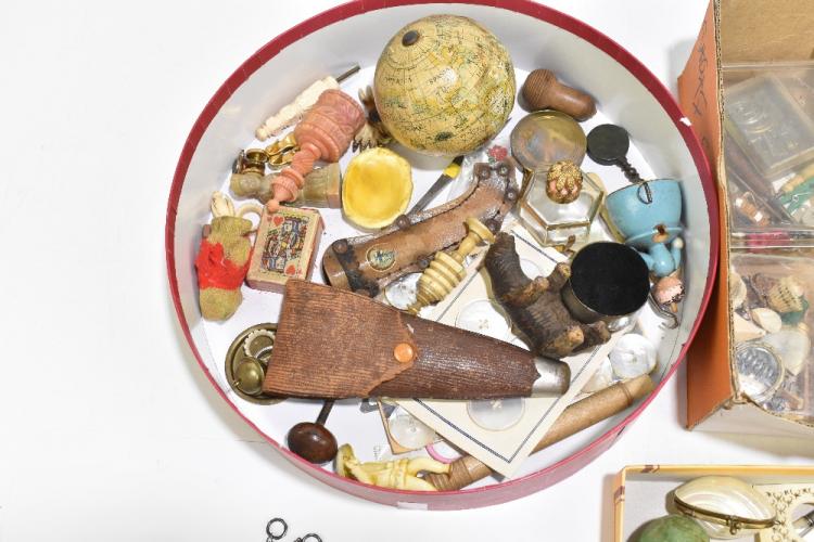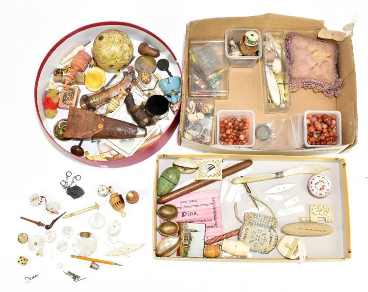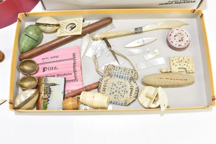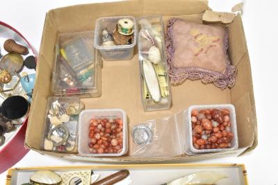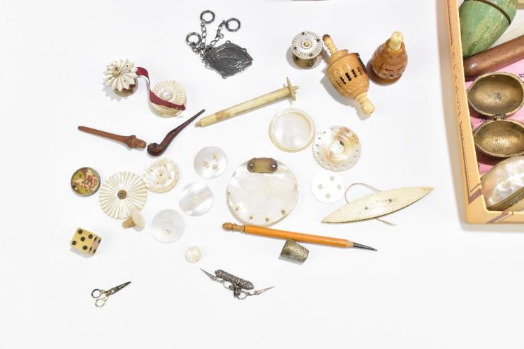 Lot 52 of 1033: A collection of assorted sewing implements and collectors' items including two bone clamps, mother of pearl mounted pincushion, diameter 4.5cm, Black Forest bear, mother of pearl gaming counters, etc.