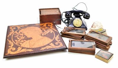 Lot 56 of 1033: A group of magic lantern slides (some af), a carved shell with inscription 'Preludio', a decorative wooden panel featuring female bust, a black Bakelite telephone and a studio pottery vase by Philip Joley.