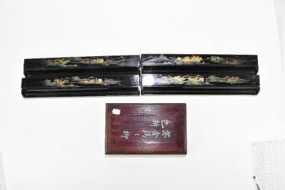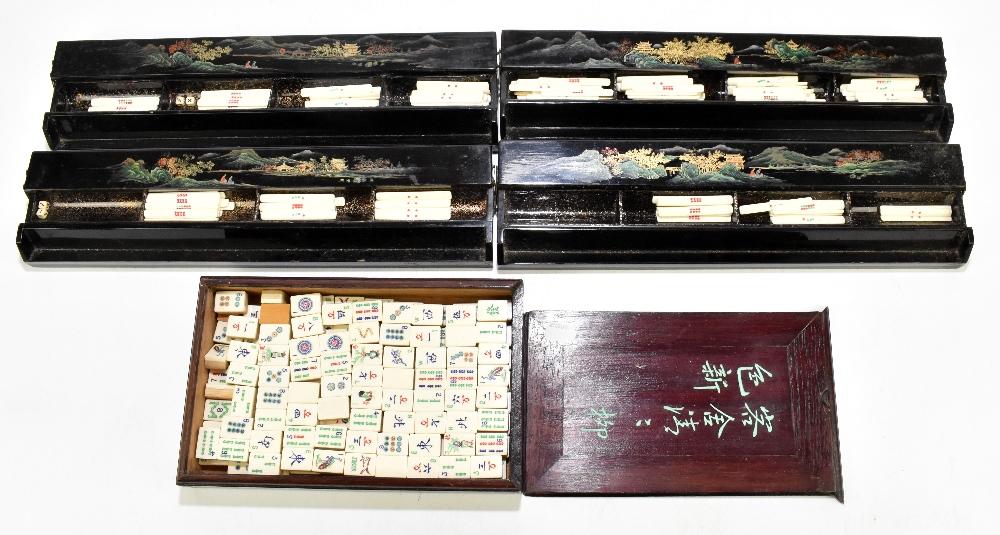Lot 58 of 1033: A vintage mahjong set with bamboo backed tiles in inscribed box with sliding lid, sold with a set of four hinged black lacquered tile racks, each with sectioned interiors holding further pieces.
