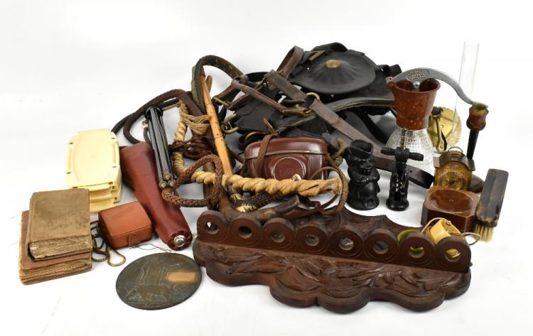 Lot 64 of 1033: A group of collectors' items including a carved oak pipe rack, a Zeiss Ikon Contina camera, a bull's pizzle, riding crops, leather horse straps, patent tie press, etc.