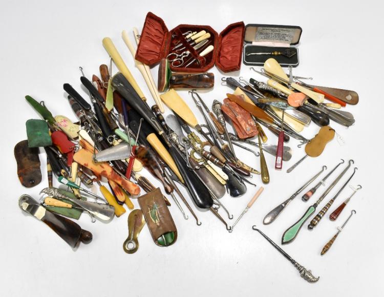 Lot 65 of 1033: A large collection of Victorian and later button hooks and shoe horns including an example with hallmarked silver finial in the form of Punch, agate examples with silver mounts, example with shagreen finial, faux tortoiseshell novelty example in the form of a boot, etc.