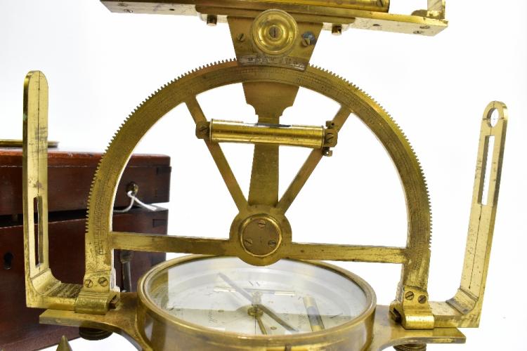 Lot 77 of 1033: WILLIAM WILTON OF CORNWALL; a good and rare mahogany cased lacquered brass theodolite with silvered signed dial, complete with brass bracket stand, sliding eye pieces, screws, etc, the case also containing three brass feet four a tripod and partial original paper label.