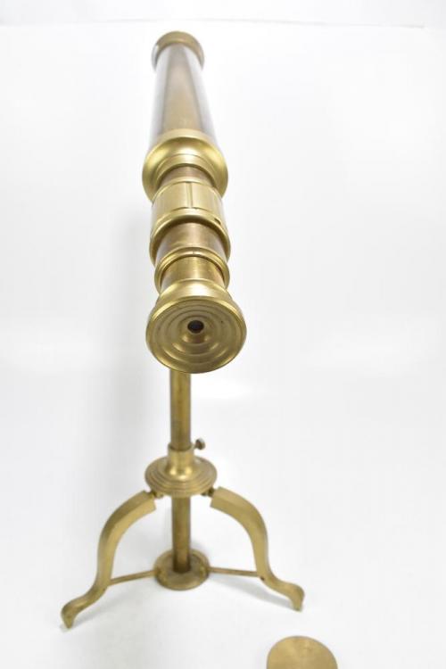 Lot 85 of 1033: A reproduction brass telescope raised on folding tripod stand, height 53cm, length 62cm.