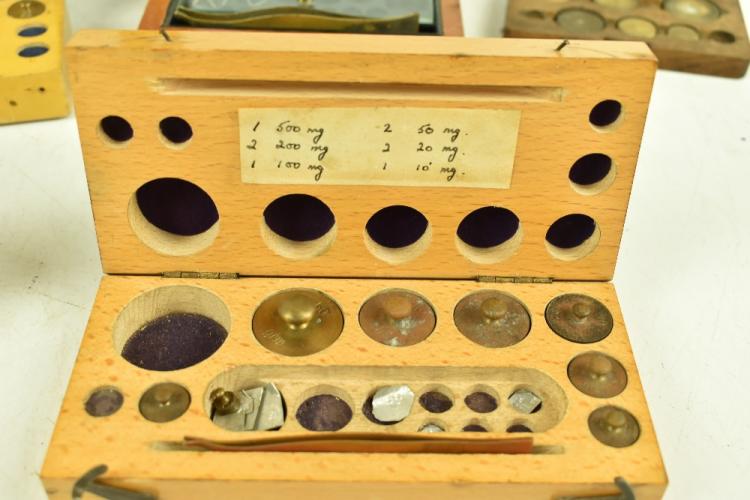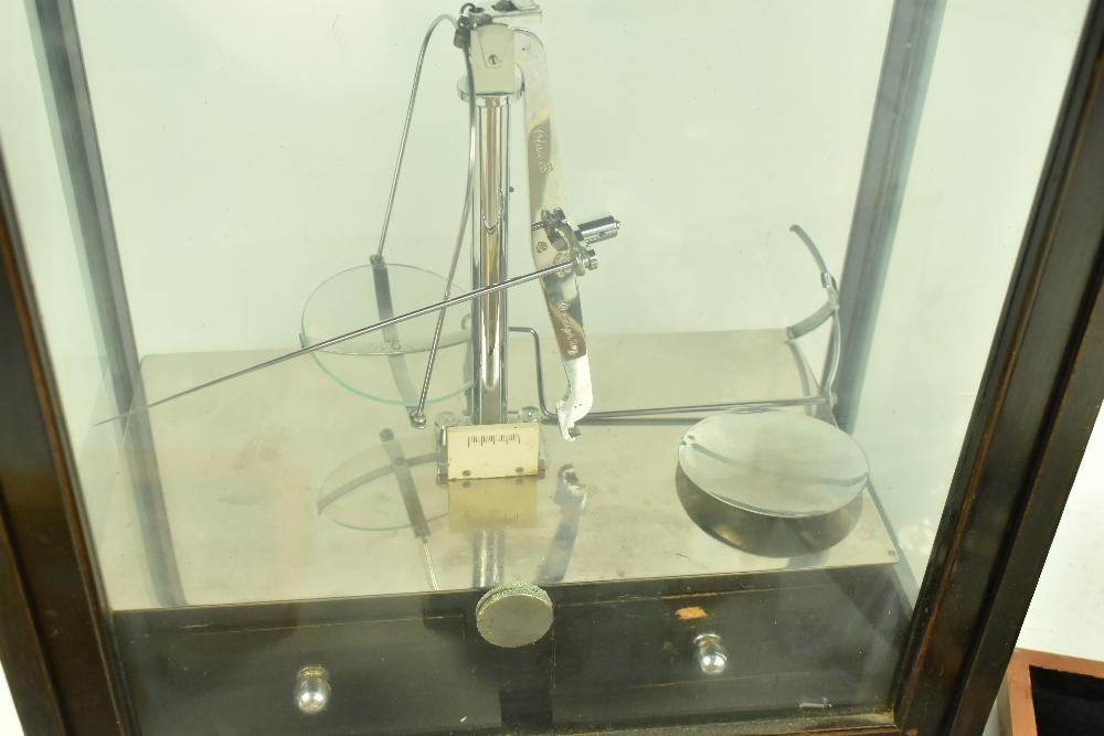Lot 96 of 1033: W A WEBB LTD; a cased set of scientific balance scales inset within wooden case, 37 x 35cm, together with a cased set of associated weights.