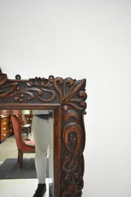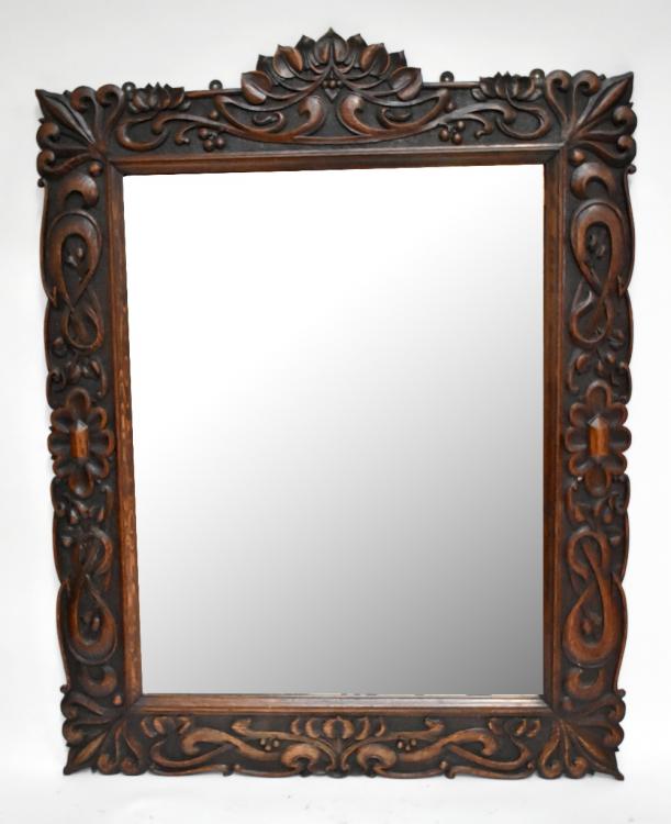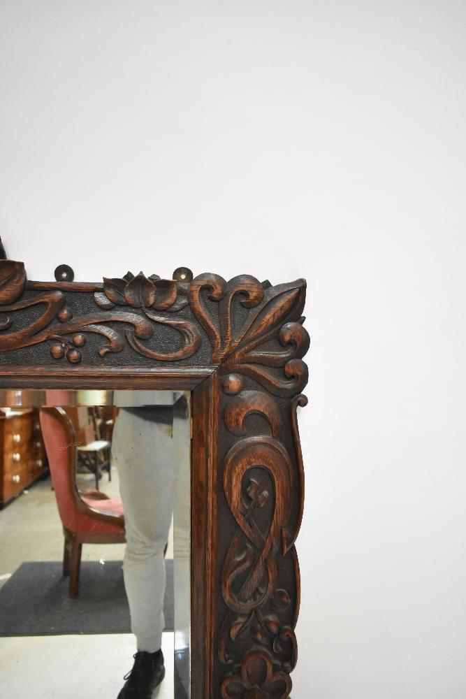 Lot 907 of 1033: A late 19th century Arts & Crafts oak rectangular wall mirror elaborately carved with stylised Celtic knot and floral motifs surrounding bevelled edged plate, 129 x 100cm.