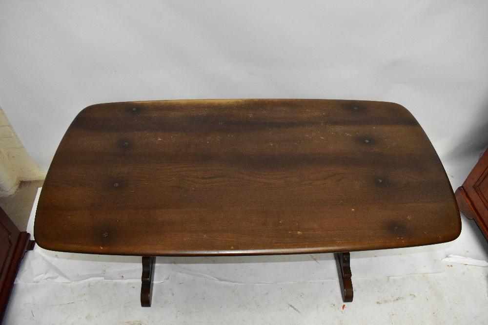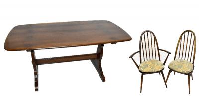 Lot 910 of 1033: ERCOL; a dark elm refectory-type dining table, height 72cm, length 151cm, and six hoop back dining chairs (4+2) (7).