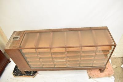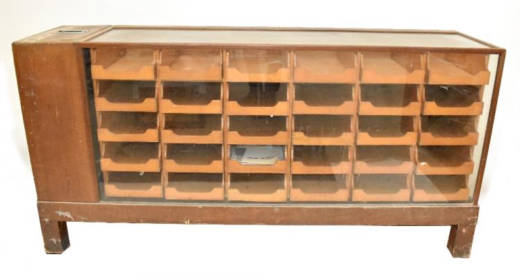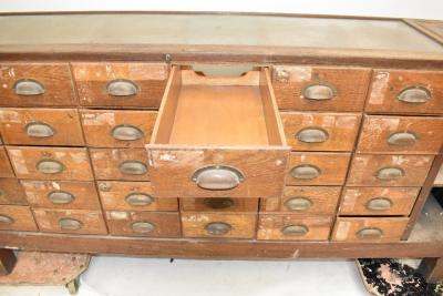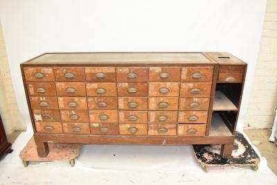 Lot 915 of 1033: A mid-20th century oak framed haberdashery cabinet of rectangular form housing thirty drawers, with end cash register section, raised on block supports, length 182cm, depth 47cm, height 92cm.