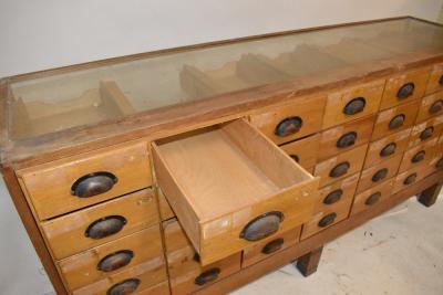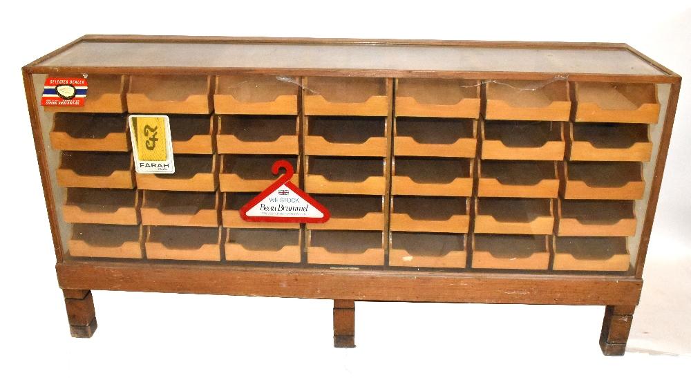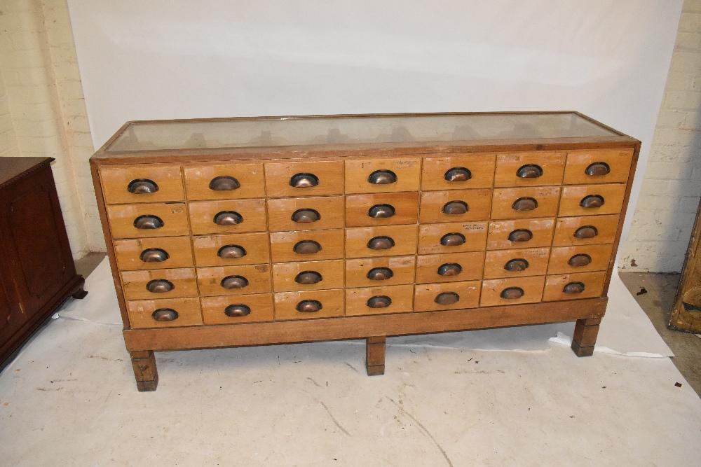 Lot 916 of 1033: A mid-20th century oak haberdashery cabinet of rectangular form housing thirty-five drawers, raised on block feet, length 181cm, depth 47cm, height 92cm.