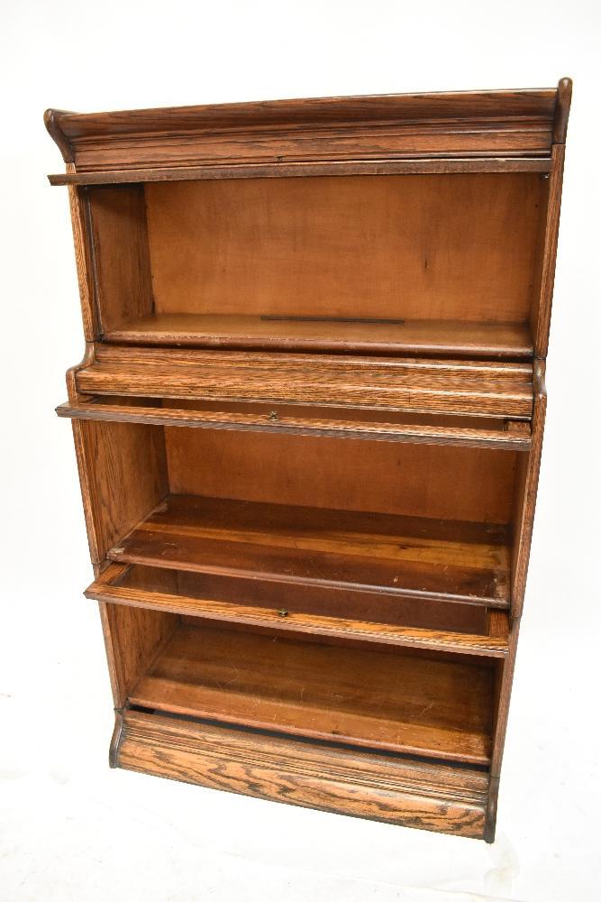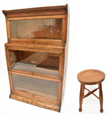 Lot 920 of 1033: GLOBE WERNICKE; an oak three tier stacking bookcase with glazed pull-up doors, height 139cm, width 87cm, depth at base 41.5cm, and a stool (2).