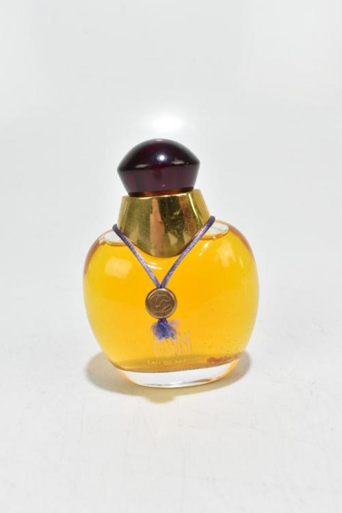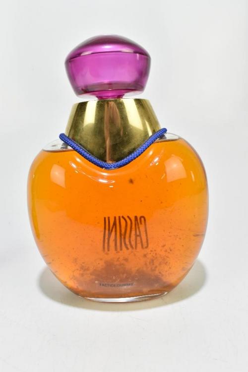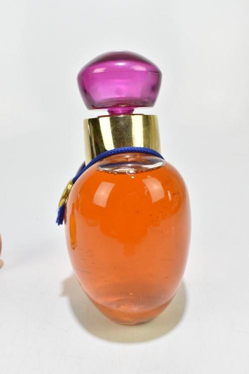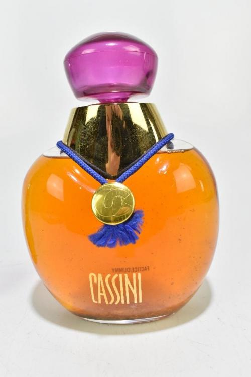 Lot 8 of 2175: CASSINI BY OLEG CASSINI; a large vintage display dummy perfume factice, circa 1990s, height 9.5"/24cm, with an original roped gold tone tag about its neck, and a smaller identical bottle, 4"/11cm (2).