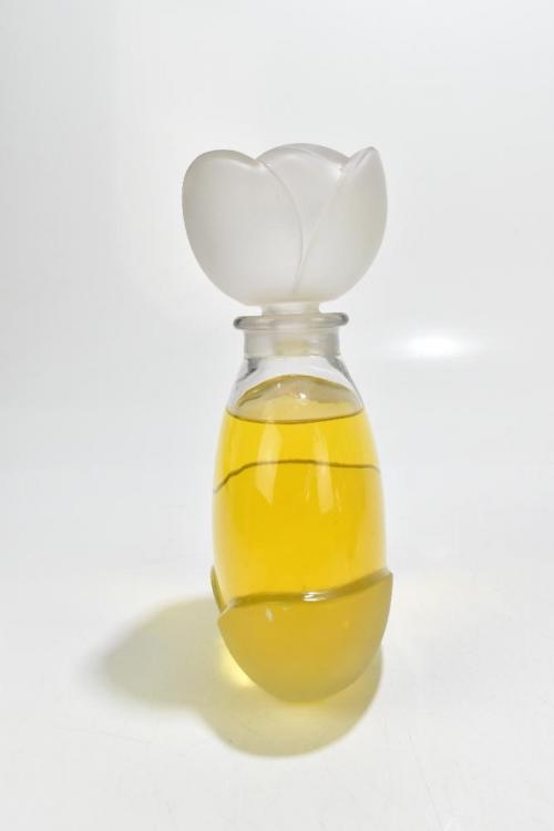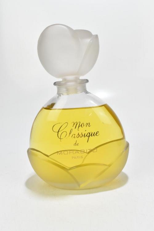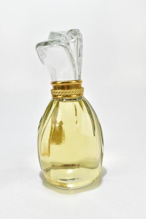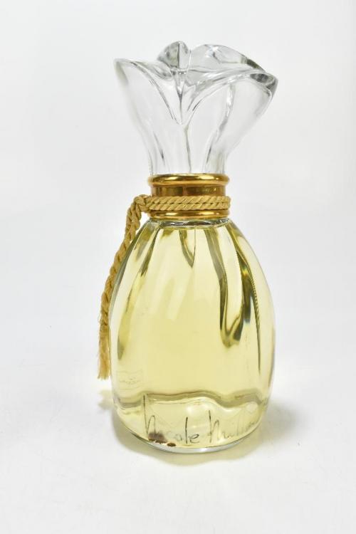 Lot 14 of 2175: NICOLE MILLER; a giant heavy glass vintage display dummy perfume factice decorated with rope, circa 1993, height 12"/31cm, and a Mon Classique de Morabito Paris large vintage display dummy perfume factice with a large glass stopper, circa 1980s, height 10"/24cm (2).