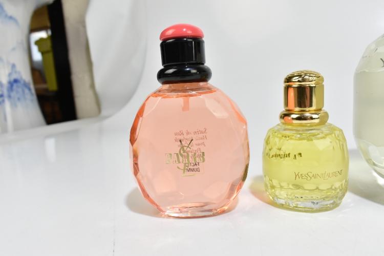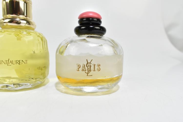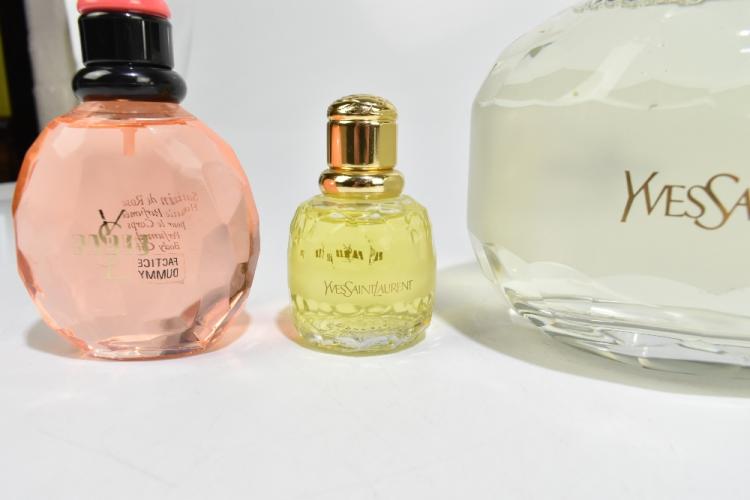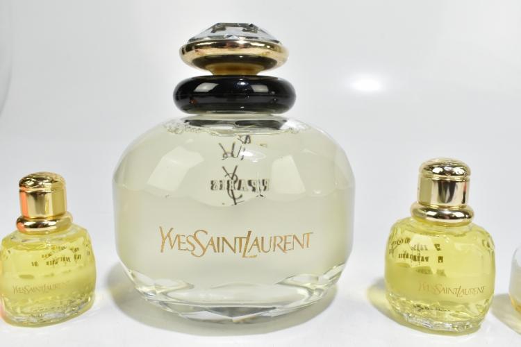 Lot 25 of 2175: YVES SAINT LAURENT; a large 'Paris' perfume dummy factice, the glass bottle with faceted edges, height 15cm, two small 'Paris' factices, and a YSL small factice, also some used 'Paris' perfume (6).