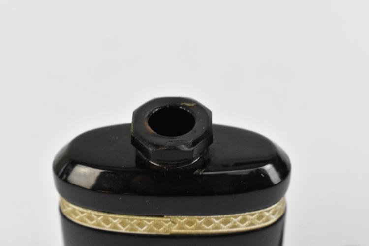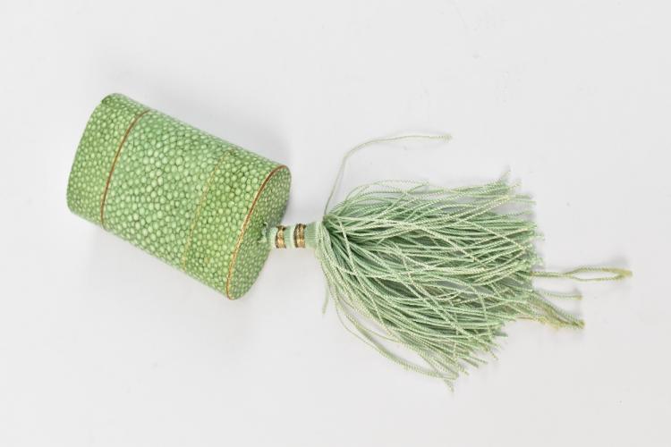 Lot 32 of 2175: An Art Deco amethyst coloured glass Nuit de Noel perfume bottle, inset within a faux shagreen cardboard case, length 8.5cm.