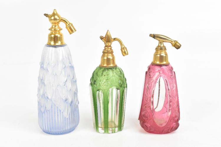 Lot 37 of 2175: Three French 1950s glass atomisers, each with moulded floral detail, the blue example stamped 'Depose', height 16cm (3).