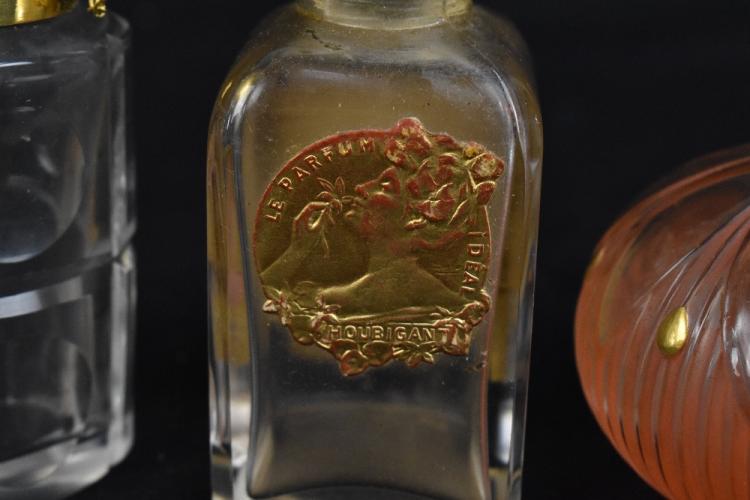 Lot 39 of 2175: A collection of four glass perfume bottles including a cased example Houbigant 'La Parfum Idéal', complete with original labels, height 10cm, etc (4).
