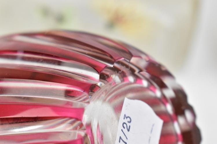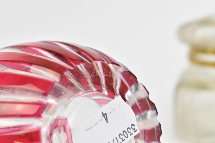 Lot 40 of 2175: VAL SAINT LAMBERT; a cranberry and clear glass atomiser and similar perfume bottle, signed to rim, height 14cm, and two Art Deco style glass powder bowls, the larger example decorated with holly, diameter 16.5cm (4).