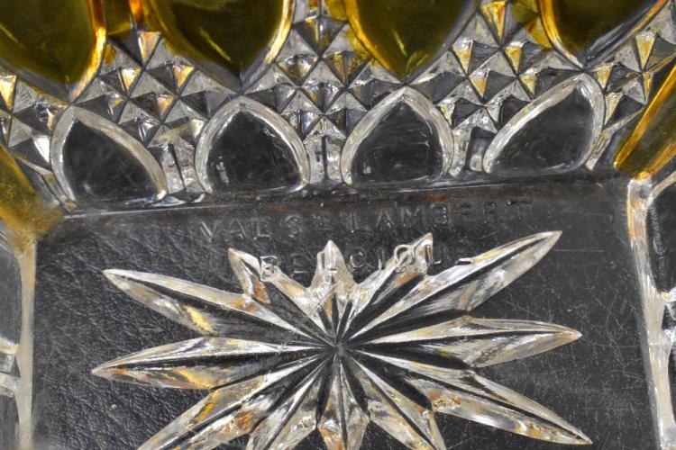 Lot 44 of 2175: An early 20th century Bohemian milk glass perfume bottle and stopper, with relief gilded floral detail, height 17cm, also a four-piece pressed glass dressing table set by Val Saint Lambert, etc (7).