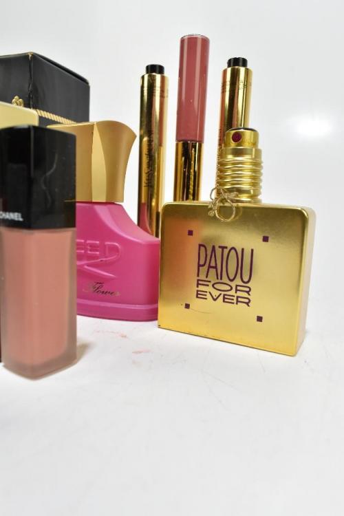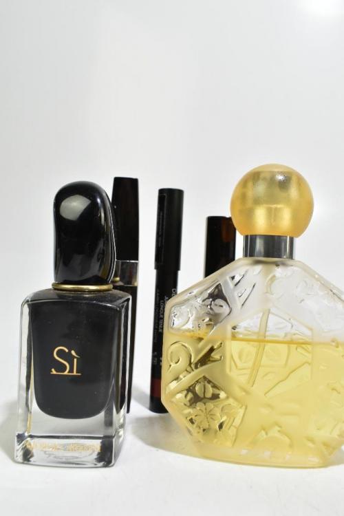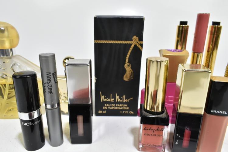 Lot 50 of 2175: A selection of vintage perfume including a part used Nicole Miller eau de parfum, a part used Giorgio Armani 'Si', a part used Creed 'Spring Flowers', a part used Patou 'Forever' (no lid) and two further perfumes, also a quantity of hardly used makeup including YSL, Chanel and Laura Mercier.