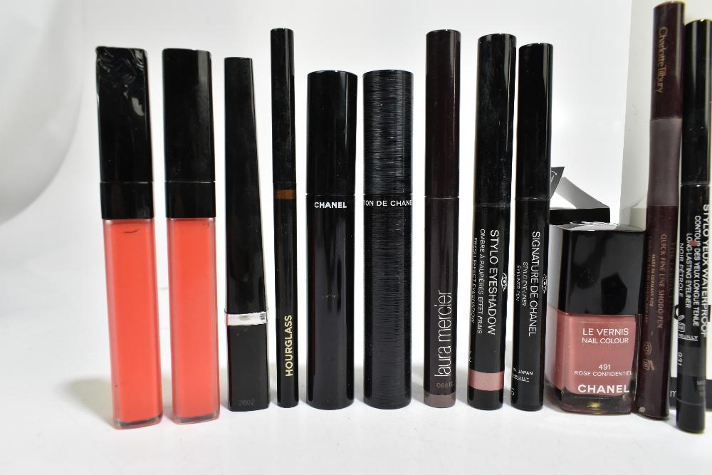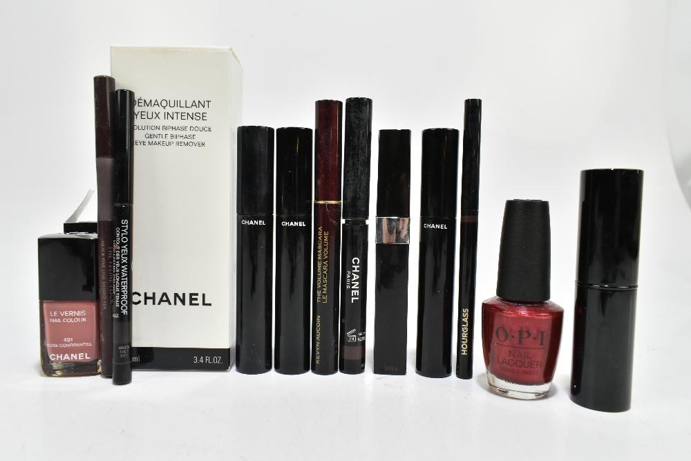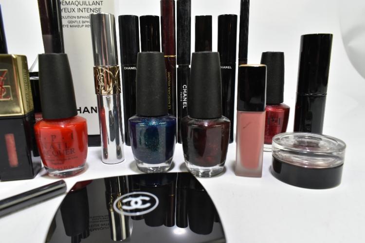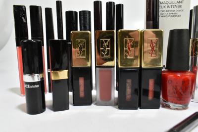 Lot 55 of 2175: CHANEL; a quantity of used and unused makeup including eye pencils, blushers and nail varnish, YSL lip gloss and lip balms and OPI nail varnish (approx. 50 items).