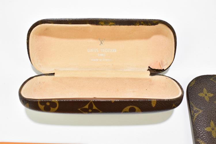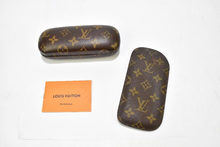 Lot 60A of 2175: LOUIS VUITTON; a monogram brown canvas leather glasses/sunglasses hard case, 16 x 7cm, and a glasses/sunglasses soft case, 8 x 17cm (2).