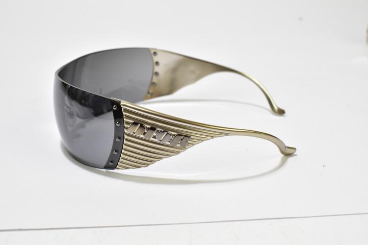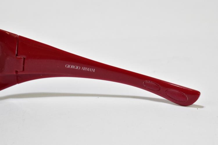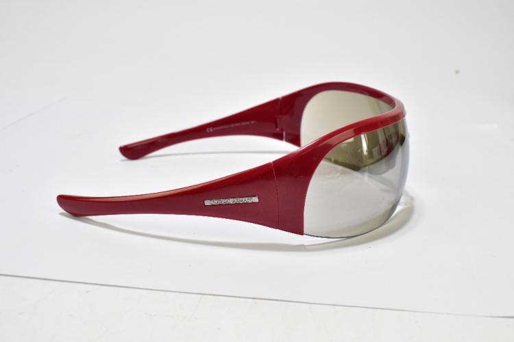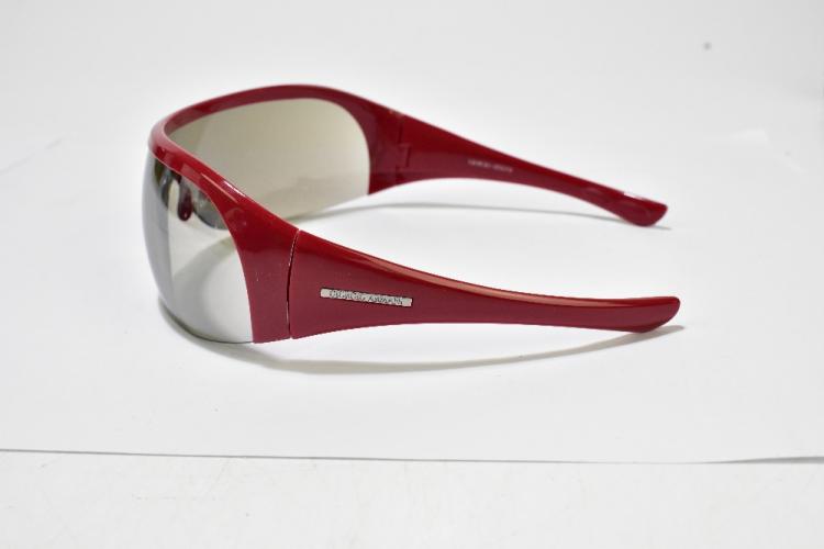 Lot 62 of 2175: DIOR; a pair of wraparound sunglasses with silver tone sides displaying the Dior logo, in original box, a pair of unused Giorgio Armani red wraparound sunglasses, in original box, and a pair of Christian Dior variegated lens sunglasses with silver tone stars around the lenses and Dior logo, not in original box (3).