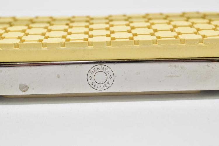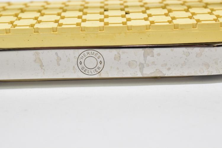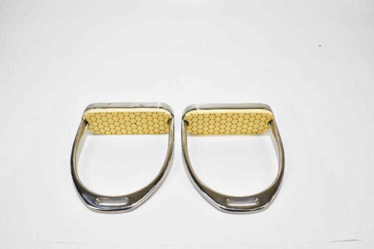 Lot 67 of 2175: HERMÈS; a pair of limited edition stainless steel 'Clou de Selle' stirrups, with anti-skid and interchangeable rubber sole, engraved with 'Hermès Sellier Clou de Selle', size 125, brand new with dust bags. The clou de selle is the centrepiece that unties the small and large quarters to the saddle tree).