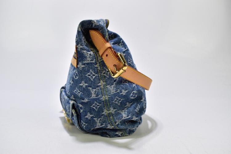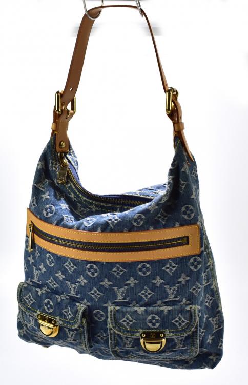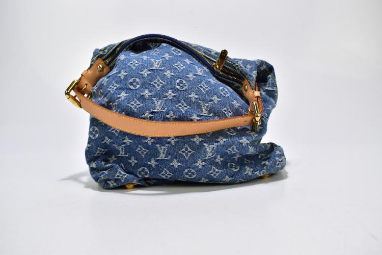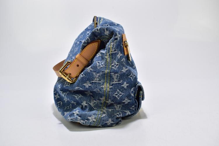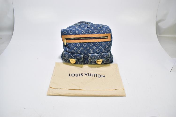Lot 169 of 2175: LOUIS VUITTON; a blue denim monogram 'Baggy GM' bag made from monogram denim with beige leather trim and gold tone hardware, with a zip fastening top and a large zip pocket at the front, alcantara lined interior two two patch pockets to the front, no.SB1025, 34 x 35 x 13cm.