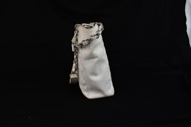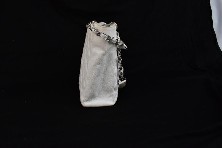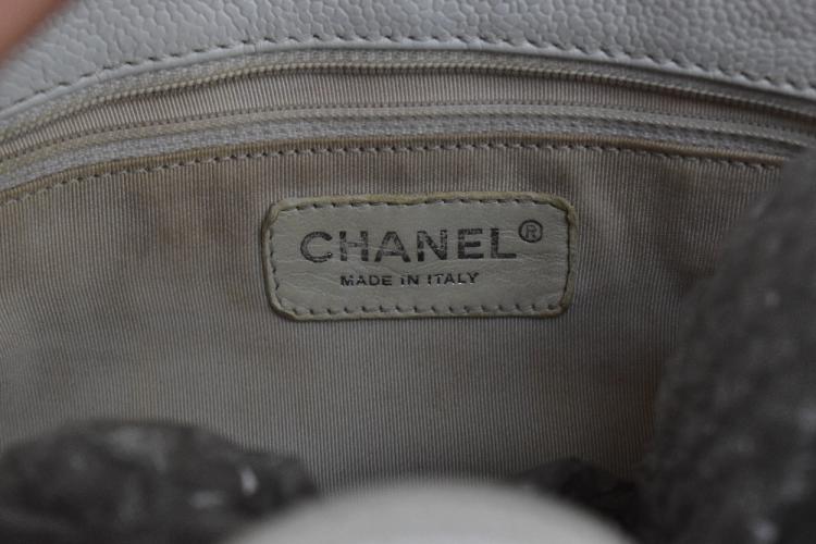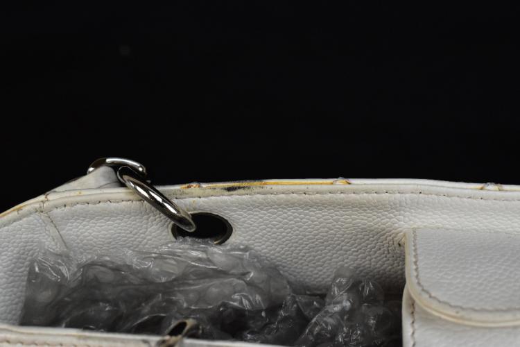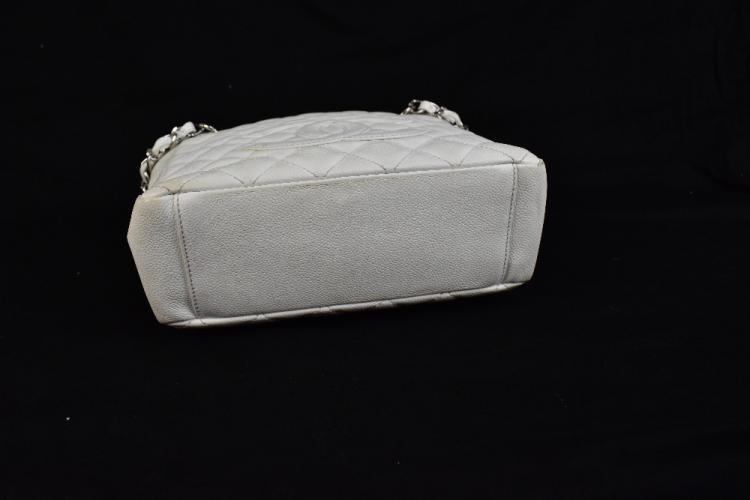 Lot 175 of 2175: CHANEL; a white caviar petite tote bag, with white quilted caviar leather, stitched double 'C' monogram to front, double woven flat leather handles with silver tone and leather straps, snap closure, back pocket, fabric lining with zip pocket, ID no.1336054, 24 x 24 x 8cm.