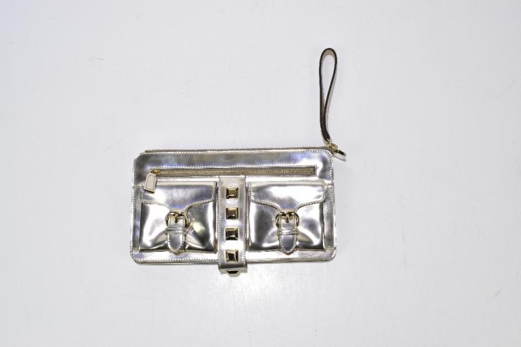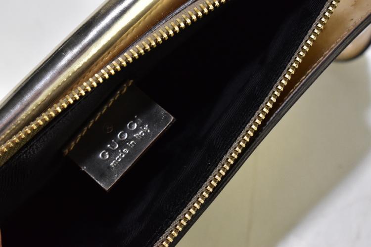 Lot 179 of 2175: GUCCI; a gold patent leather and gold studded clutch bag with a pop studded opening one side, a zip top and two pockets on the other side with a wristlet, no.197025001364, with dust bag.