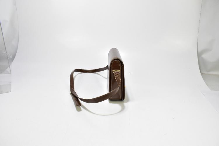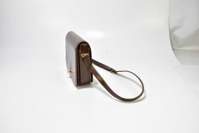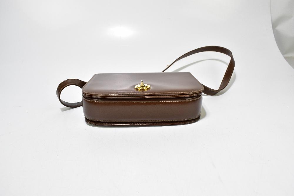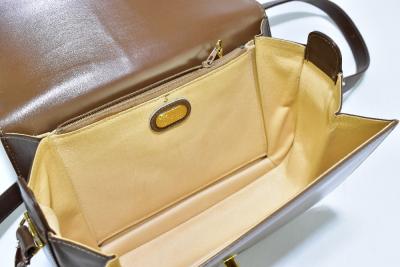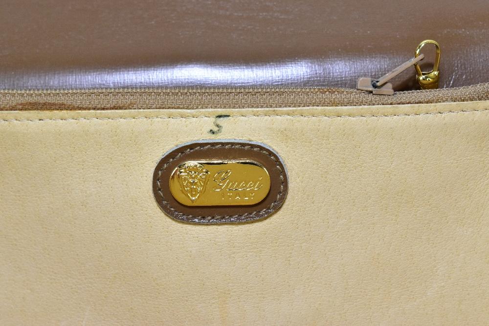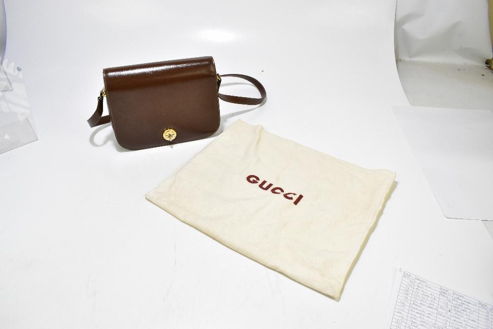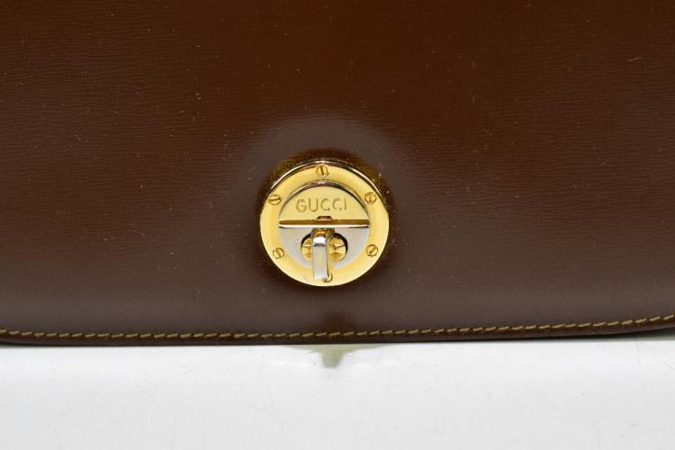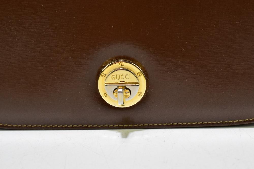 Lot 181 of 2175: GUCCI; a brown epi leather D-shaped cross body shoulder bag, with front flap and gold and silver tone twist lock embossed 'Gucci', shoulder strap, and Gucci logo to the gold tone shoulder strap attachments, with cream calfskin lining to the interior and one zip pocket with small gold tone Gucci charm and plaque inscribed 'Gucci Italy', 24 x 18 x 6cm.
