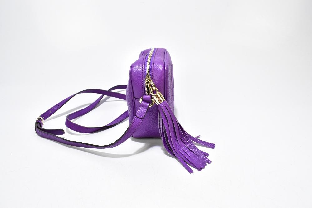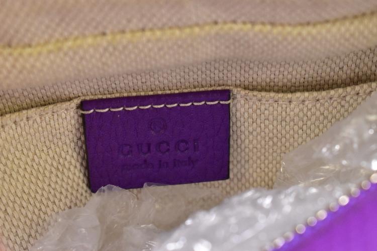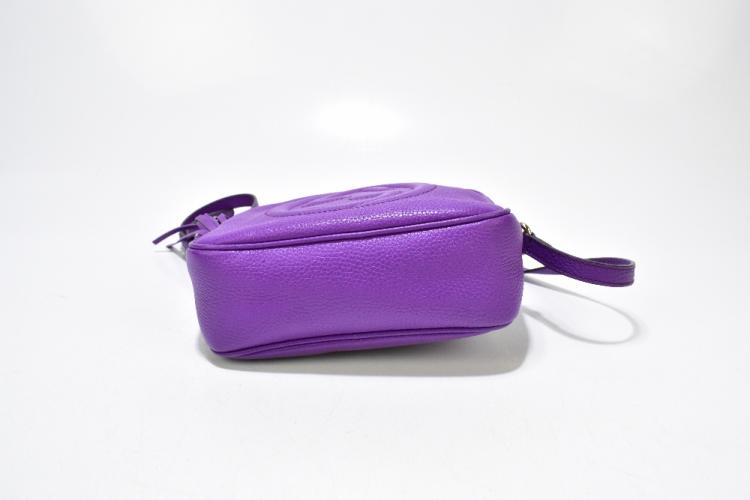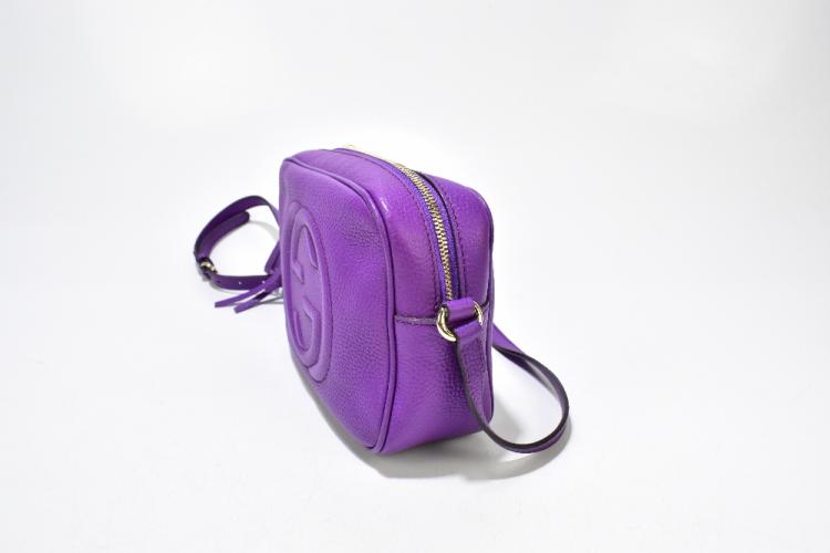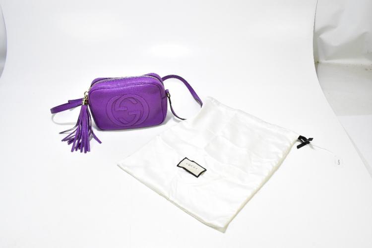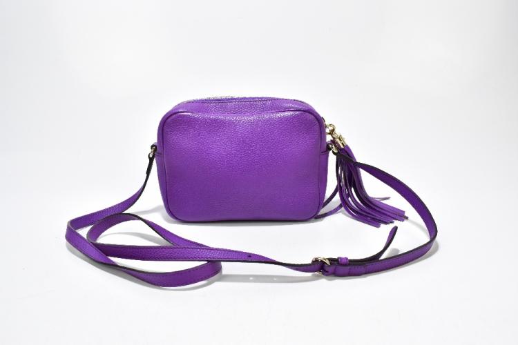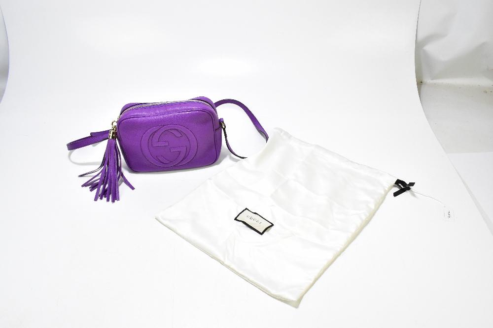 Lot 183 of 2175: GUCCI; a purple natural grained leather 'Soho' disco crossbody bag with shoulder adjustable strap, gold tone hardware and zip to the top, a large leather tassel and a cloth lining, no.C01950338, 21 x 15 x 7cm, with original dust cover.