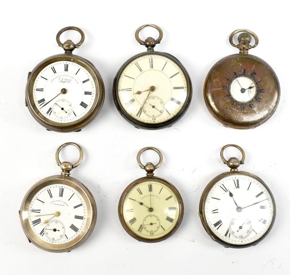 Lot 511 of 2175: Two hallmarked silver cased key wind pocket watches to include an example signed 'Alfred Russell & Co', with Roman numerals and subsidiary seconds dial, diameter 40mm, together with a hallmarked silver cased half hunter pocket watch, a further open face example stamped '935' to the case, a dial signed 'Henry E. Peck, London' and two further pocket watches (af) (6).