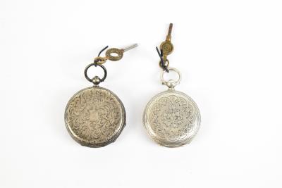 Lot 517 of 2175: A white metal lady's fob watch, the face with engine turned detail, set with Roman numerals and subsidiary dial, with white and yellow metal floral border, diameter 40mm, together with a further fob watch stamped 'fine silver', circular dial with Roman numerals inside yellow metal scrolling border, diameter 38mm (2).