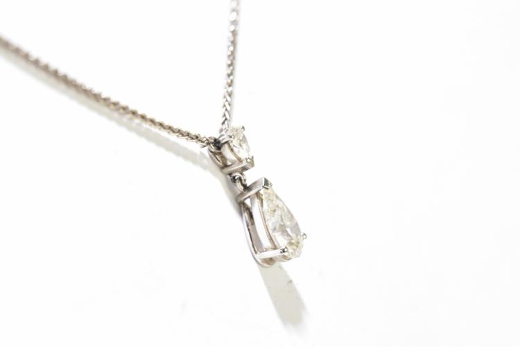 Lot 1392 of 2175: A stunning platinum and diamond necklace, the lower pear shaped diamond weighing approx 2.25ct beneath a smaller pear shaped diamond weighing approx 0.45ct, suspended on a fine link chain, length of chain 40cm, approx 7.4g.