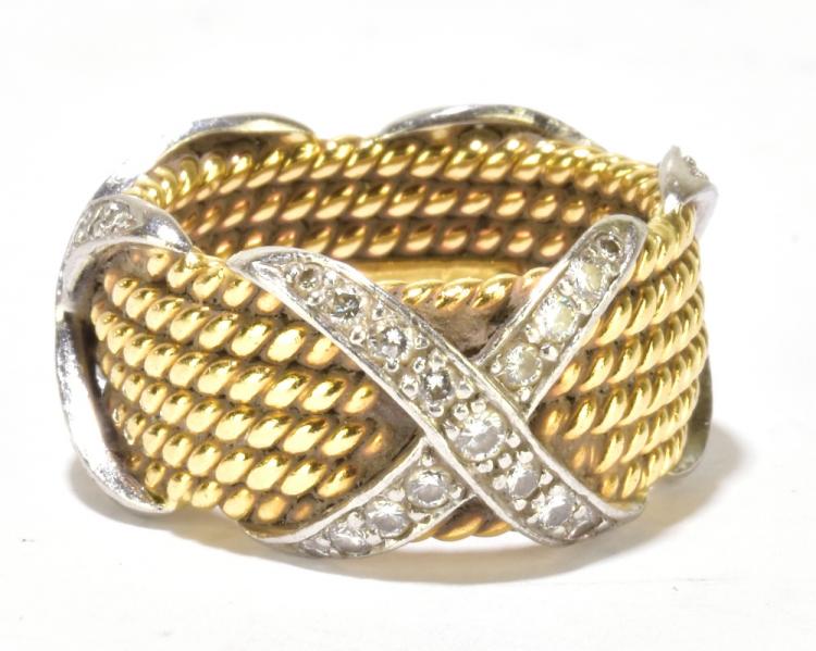 Lot 1397 of 2175: TIFFANY & CO; an 18ct yellow gold, platinum and diamond set Schlumberger ring set with fifty one diamonds to the raised X decoration, size I, approx 11.7g.