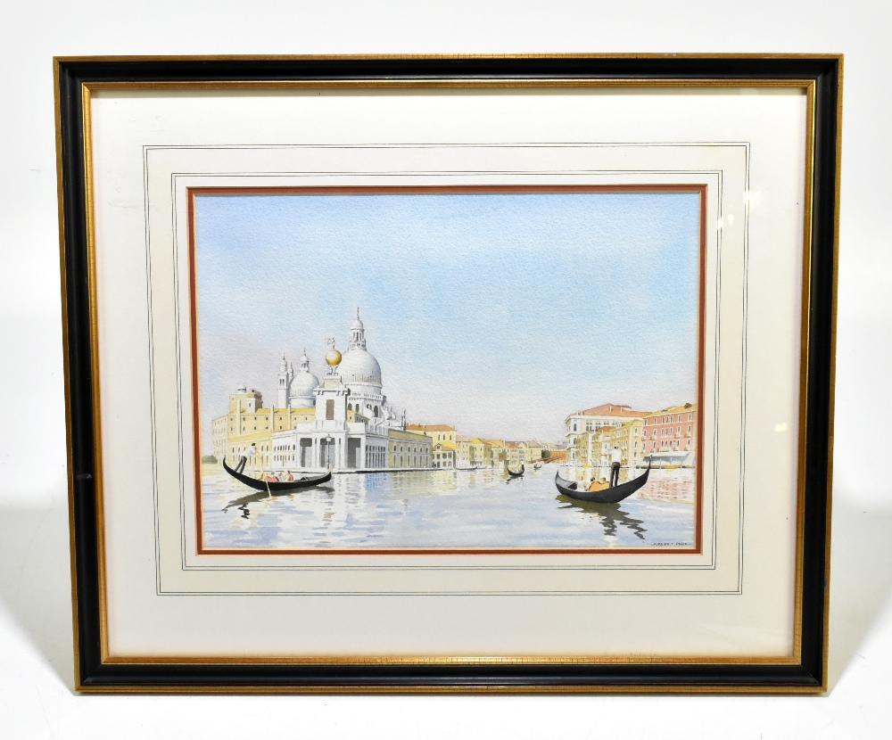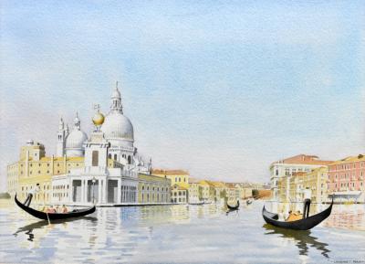 Lot 2402 of 2175: LAURENCE T PEACE; watercolour, ‘Ponta della Dogana and the Grand Canal’  Venetian scene, signed lower right, 26.5 x 37cm, framed and glazed. (D)