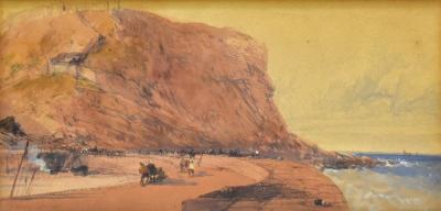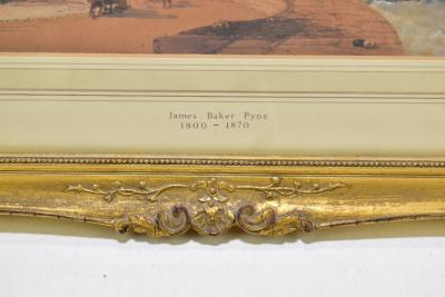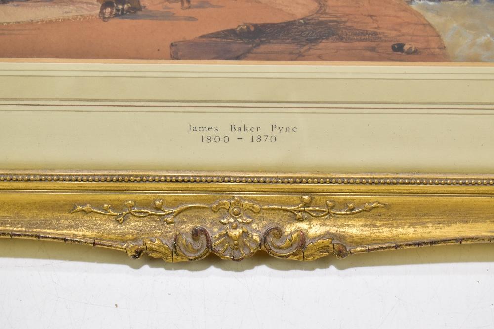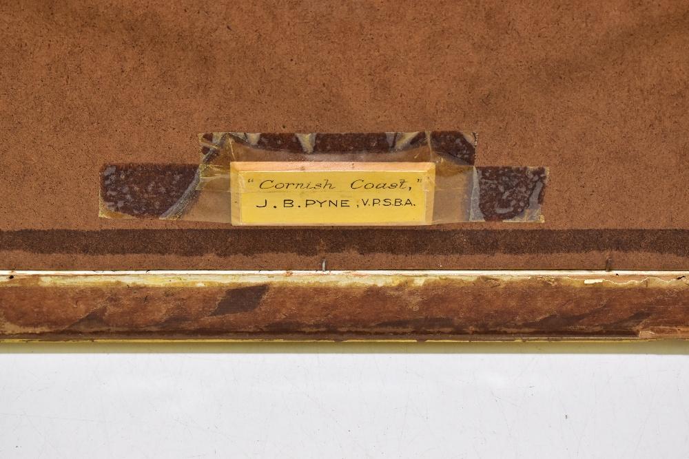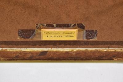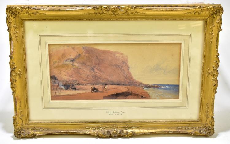 Lot 2407 of 2175: JAMES BAKER PYNE (1800-1870); watercolour, 'Cornish Coast', coastal landscape with figures and dry dock to foreground and cliff beyond, signed lower left, 15.5 x 34.8cm, framed and glazed.