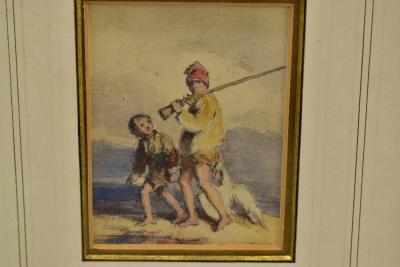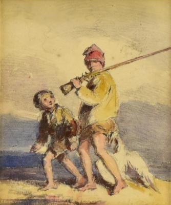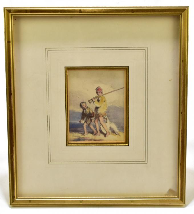Lot 2408 of 2175: 19TH CENTURY BRITISH SCHOOL; pencil and watercolour, sketch of two boys hunting fowl, the taller carrying rifle and prize, indistinctly signed lower right, 10 x 8.3cm, framed and glazed.