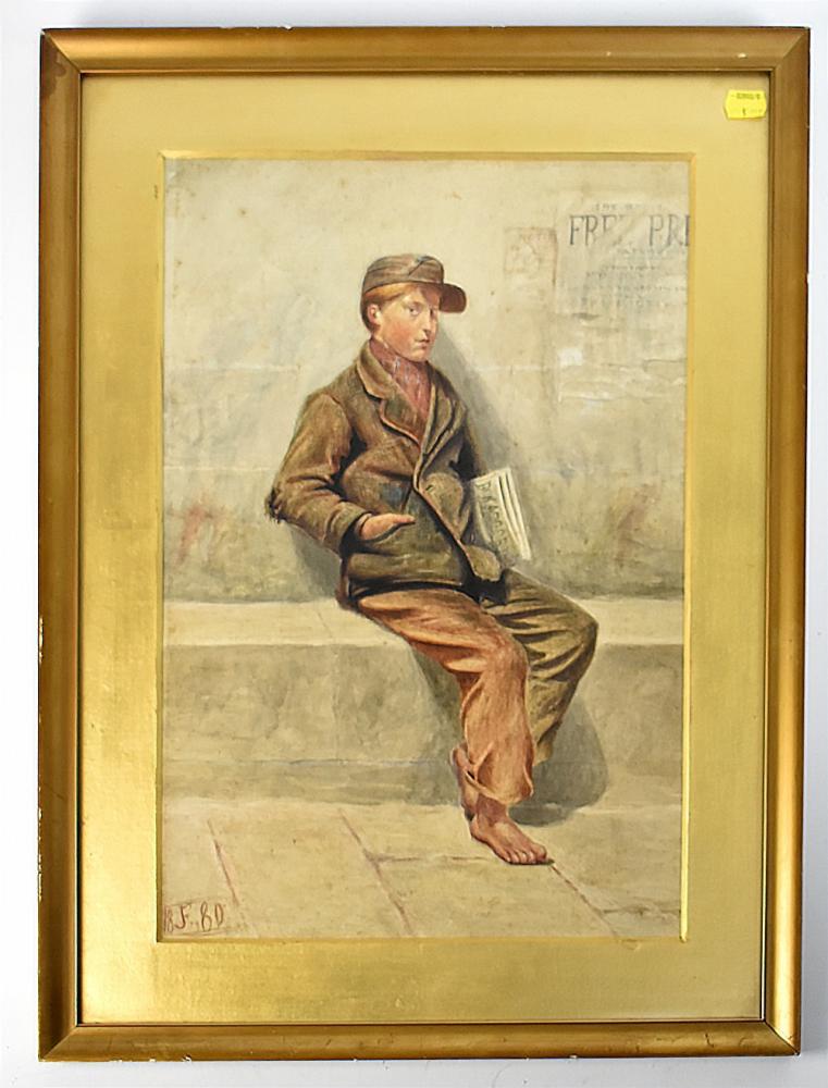 Lot 2411 of 2175: LATE 19TH CENTURY ENGLISH SCHOOL; watercolour, portrait of a boy sitting on a step holding a newspaper with advertising posters to background, signed with JF monogram and dated 1880 lower left, 48 x 33cm, framed and glazed.