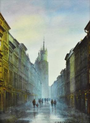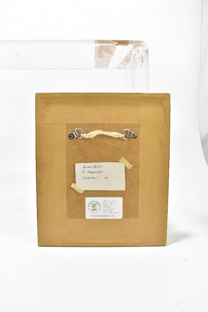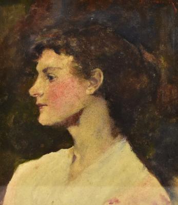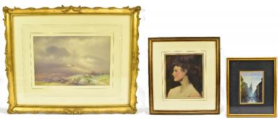 Lot 2415 of 2175: UNATTRIBUTED; watercolour, portrait, side profile of a lady, apparently unsigned, 23 x 19.5cm, together with watercolour depicting figures in Polish street scene by Mazewski, signed lower right, 13.5 x 10cm, and a further watercolour depicting a landscape scene, indistinctly signed, possibly Charles C Drittery, 16.5 x 25cm, each framed and glazed (3).