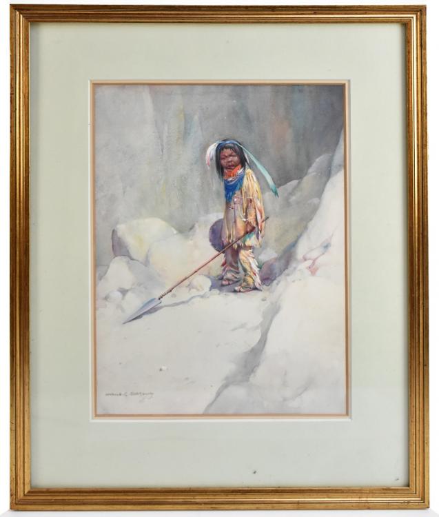 Lot 2418 of 2175: HAROLD C EARNSHAW (1886-1937); watercolour illustration for a postcard 'A Brave', signed lower left, 34 x 25cm, framed and glazed.